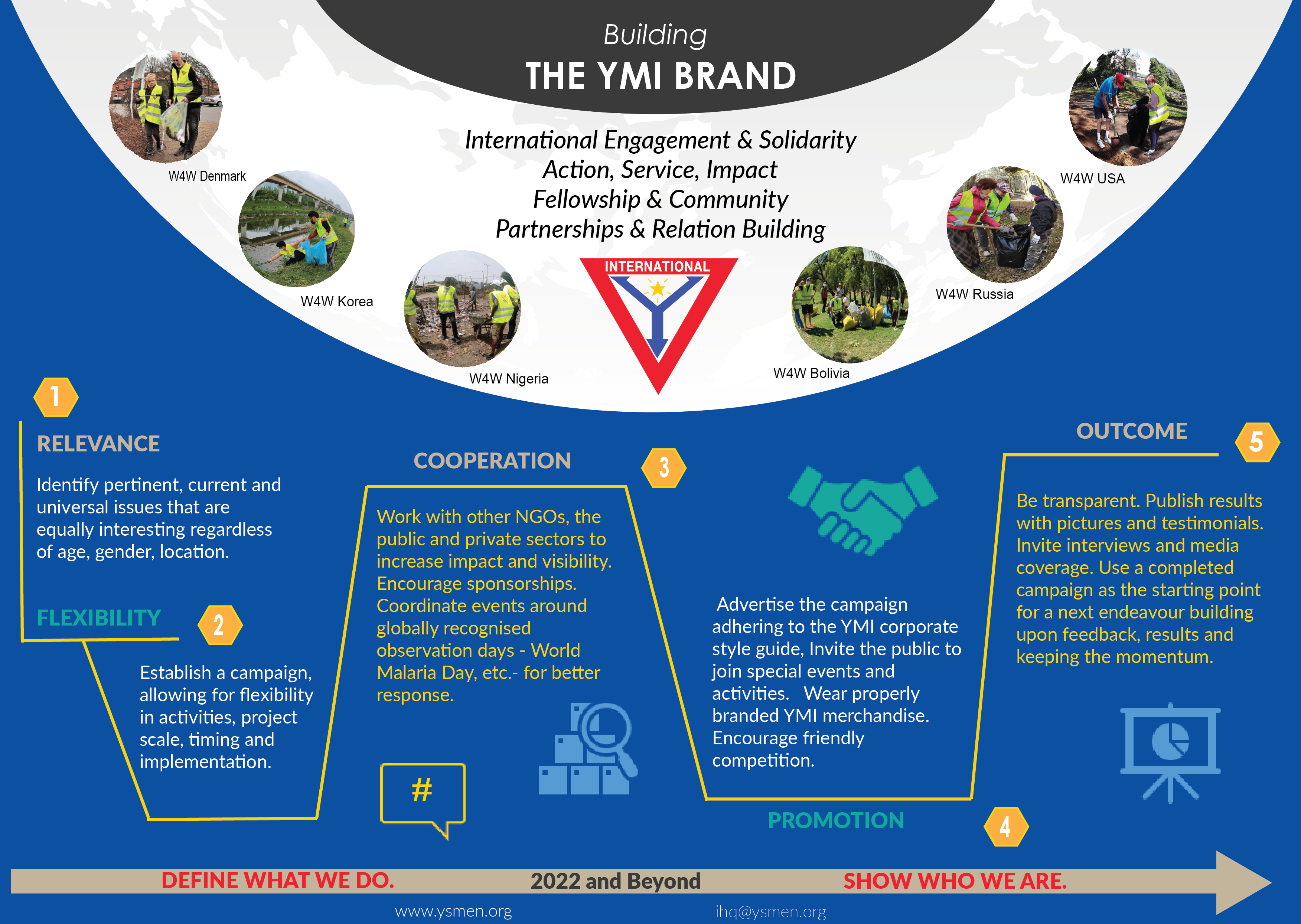 We must remember that in building the YMI brand we are looking for a formula to inspire new, younger adherents, while also honouring the current, older-generation, club member. Not a simple task obviously but not one that is insurmountable with the right cooperation, evaluation and planning. A first step is to motivate the international spirit of the movement, to reengage interest and pride in belonging to a global community without detracting from local identity and the individualised work done at home. From this renewed spirit can develop universal concepts, messaging and action campaigns, like the recently completed and successful Week4Waste initiative. Cross border cooperation also means larger impact, as well as greater visibility, bringing YMI closer to the international recognition outlined in our vision statement. Our recent joint appeal with the Global Fund to the U.S government is an example of the power of strategic partnerships in boosting brand awareness.